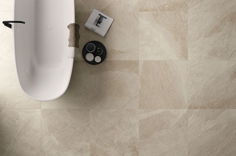 Modern sand-tone porcelain tile inspired by natural shale stone
